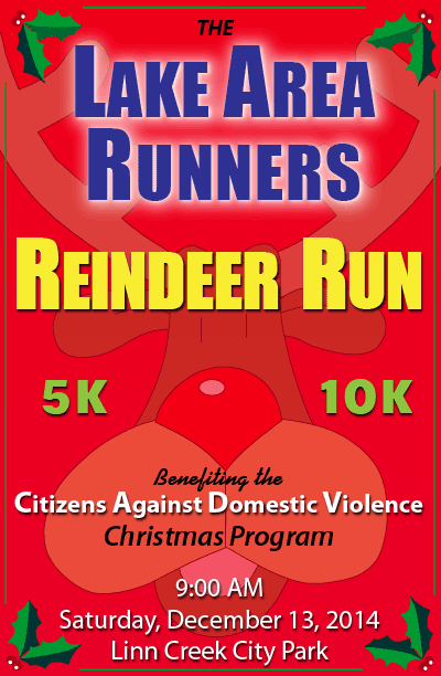 Fifty-four runners came out to Linn Creek on Saturday for the Lake Area Runners Reindeer Run. The race was a hastily-arranged opportunity for Todd Raney to reach a milestone of 400 miles raced for 2014. It also served as a fund-raiser for the Citizens Against Domestic Violence's (CADV) Christmas Program, in which the Lake area community is asked to "adopt" families in need this Christmas season. The unseasonably mild and dry weather, with calm winds and temperatures in the mid to upper 40s, helped to make the event possible.