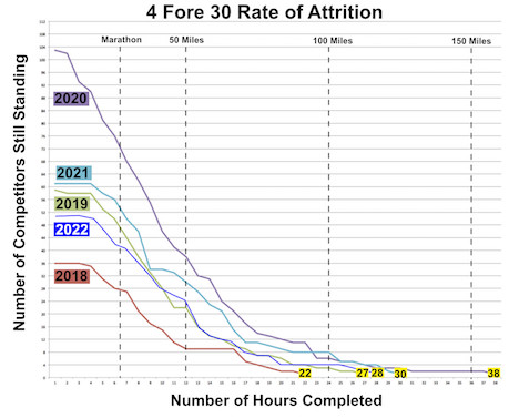 Below is a chart showing this year's rate of attrition, with prior years' shown by comparison. In line with prior years, half the starting field was gone by the 12th hour (50 miles).