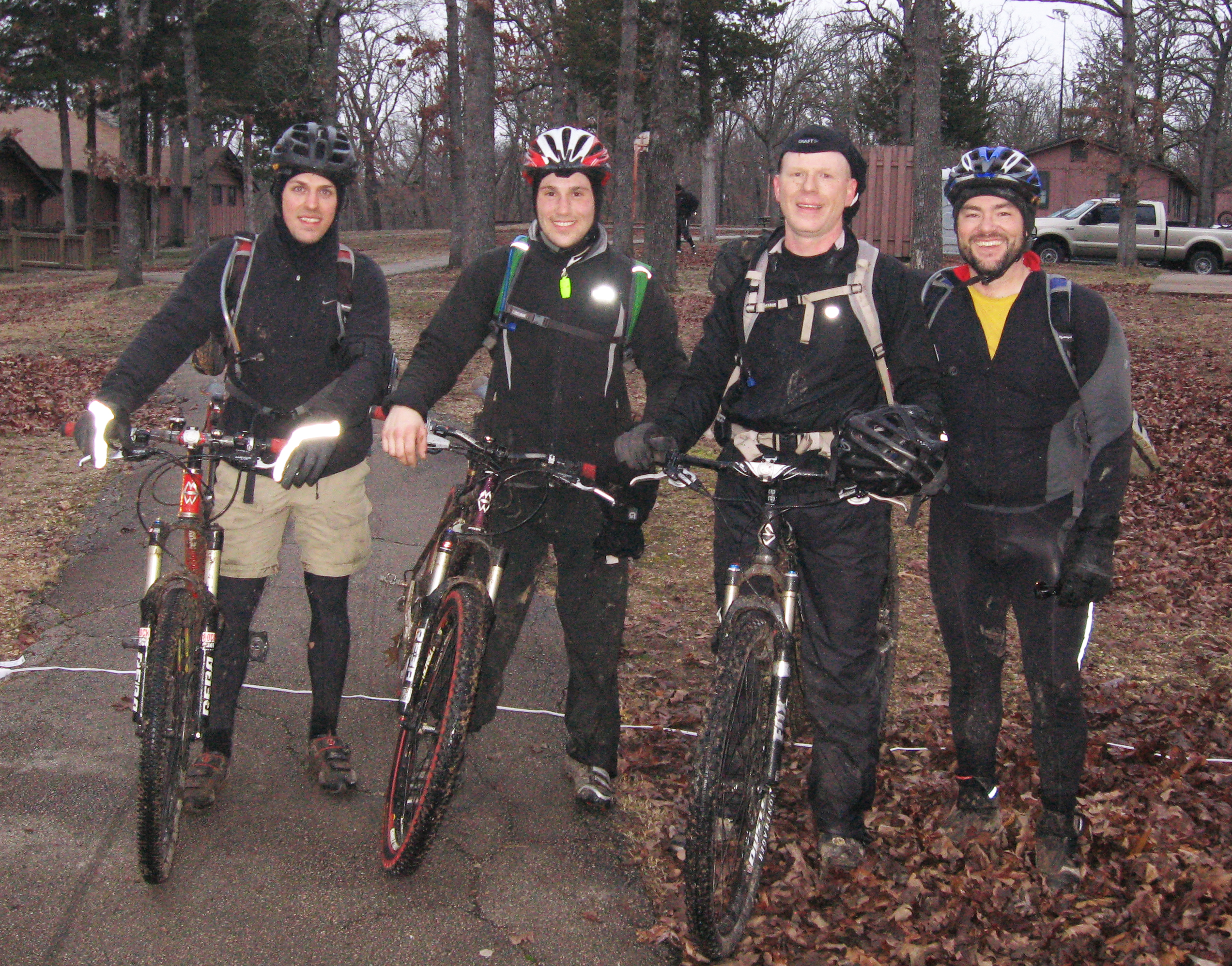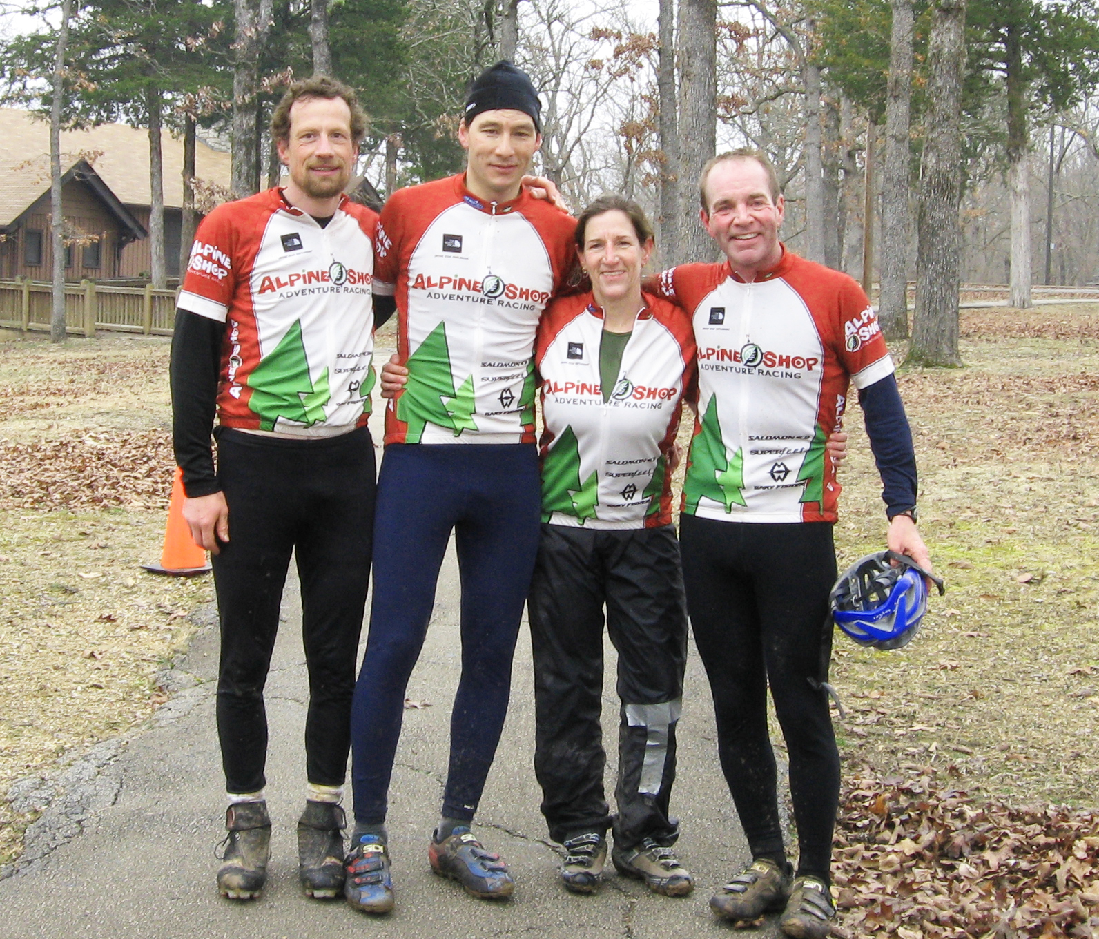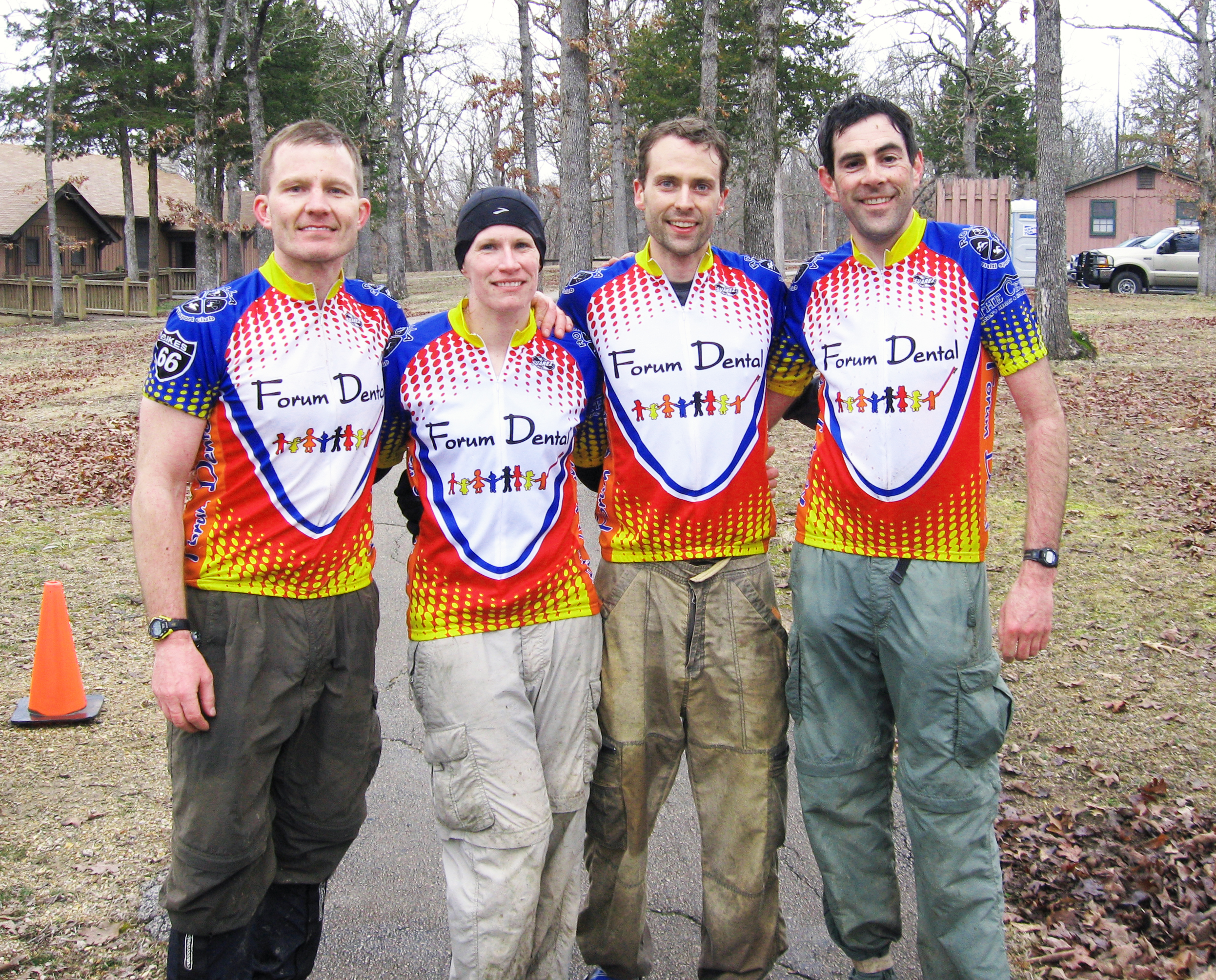 Potholes team, at end of bike segment at Camp Pin Oak. Pictured (from left): Josh Shrock, Steven Hermann, Dan Dougan, Jim Jackson. (Original image 4.6 MB)
