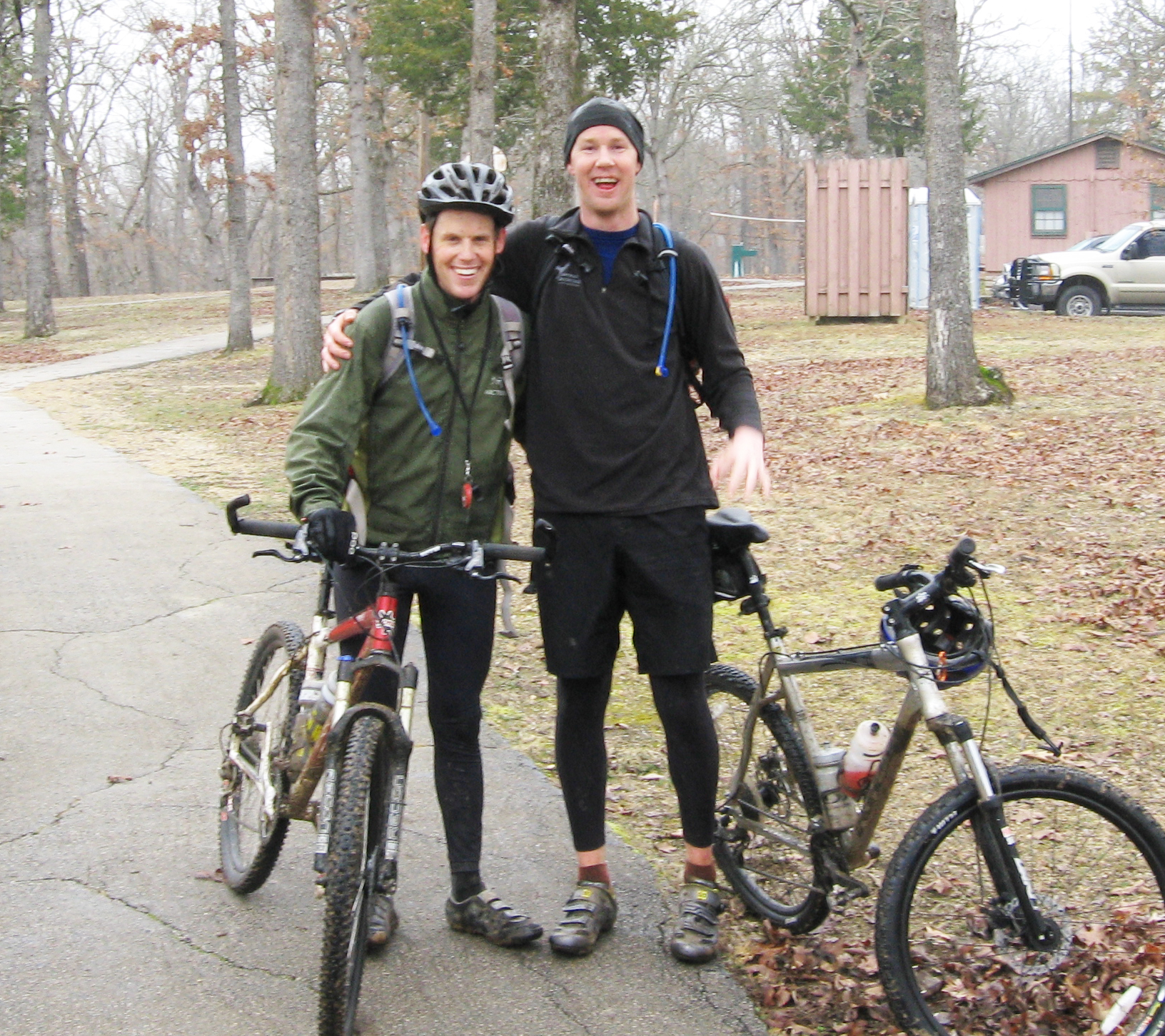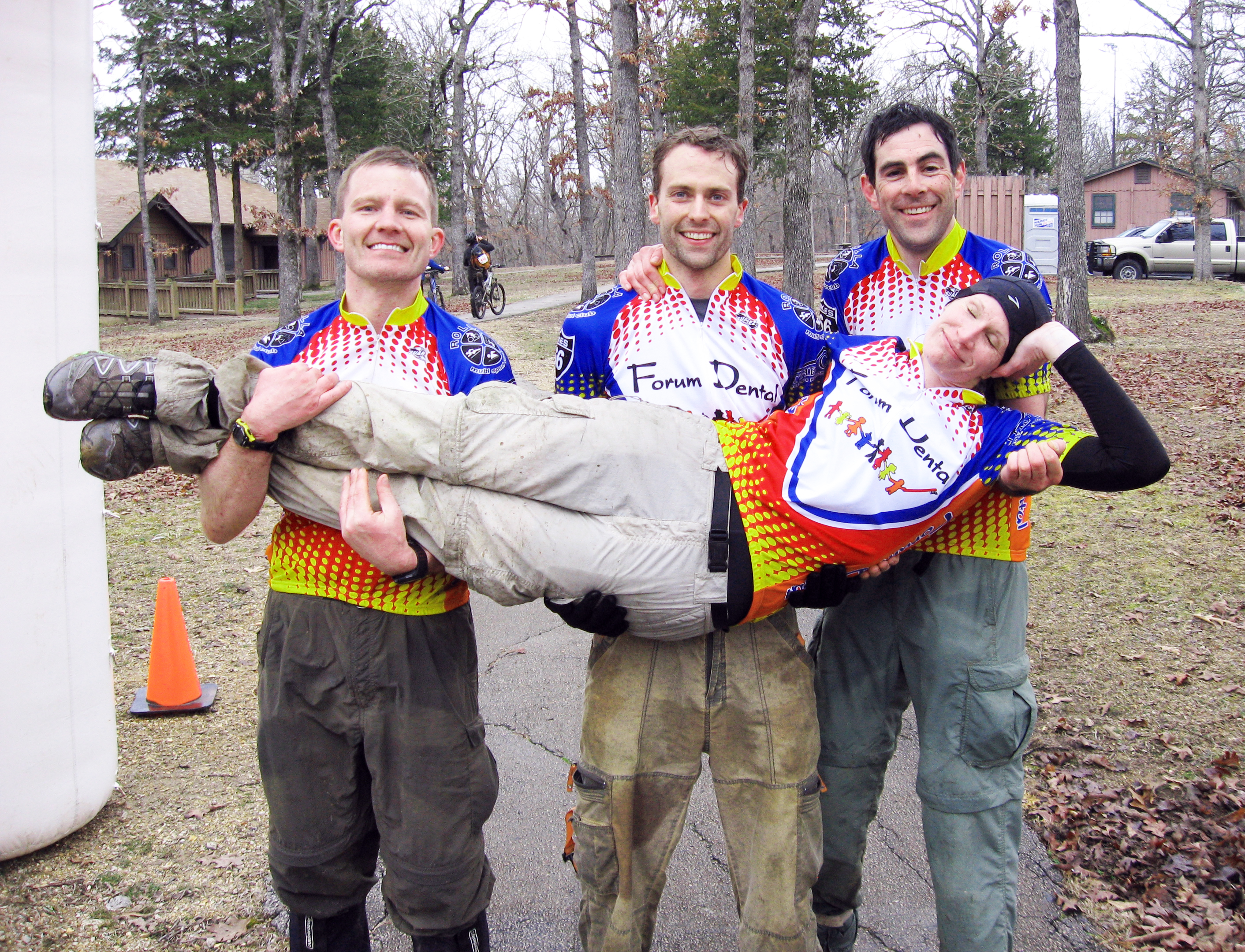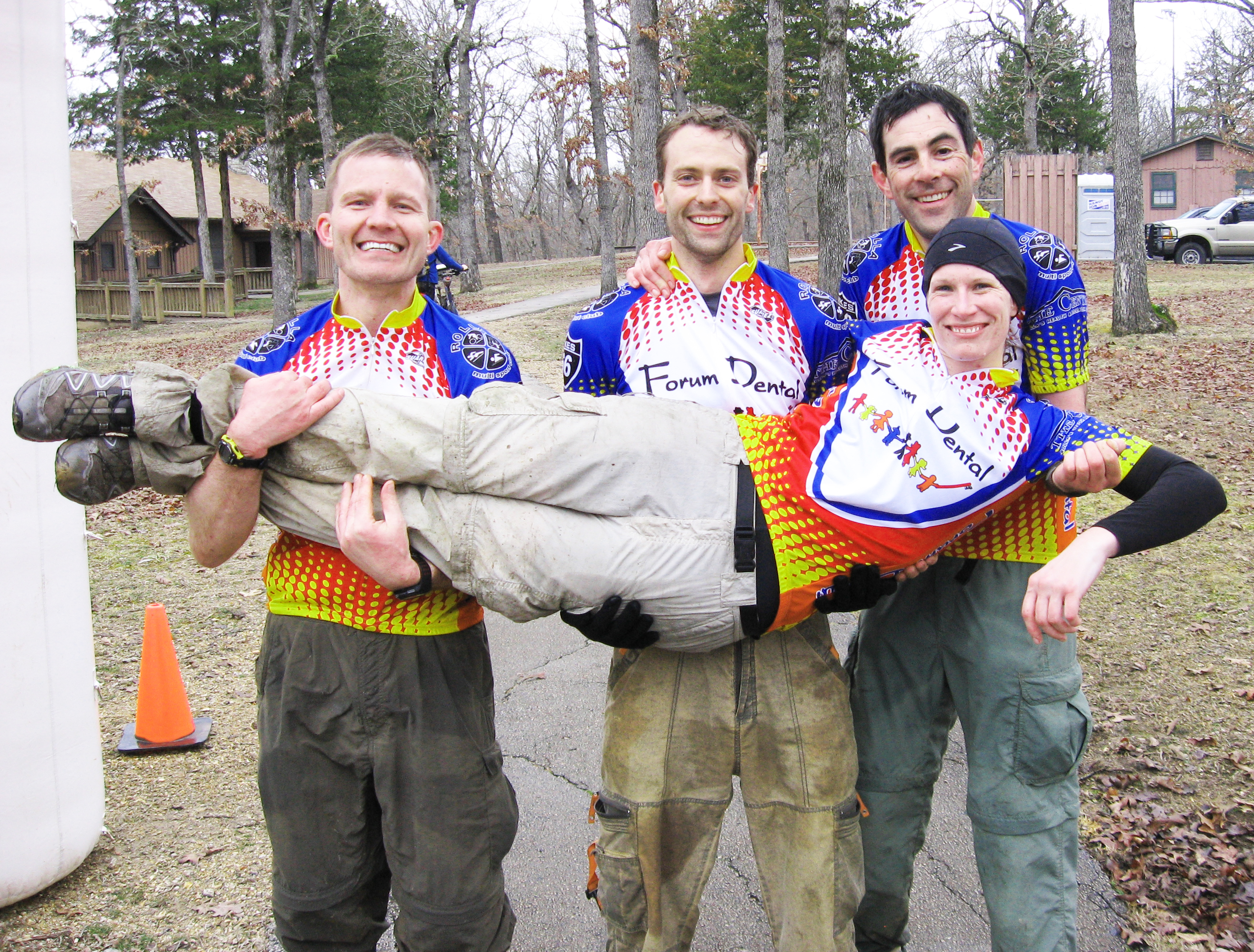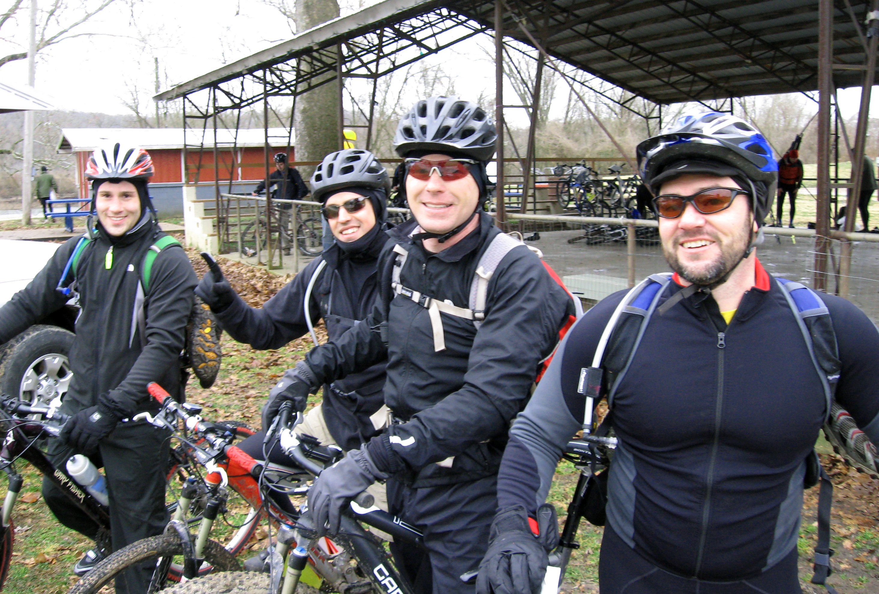 Potholes team, at end of bike segment at Camp Pin Oak. Pictured (from left): Josh Shrock, Steven Hermann, Dan Dougan, Jim Jackson. (Original image 4.6 MB)