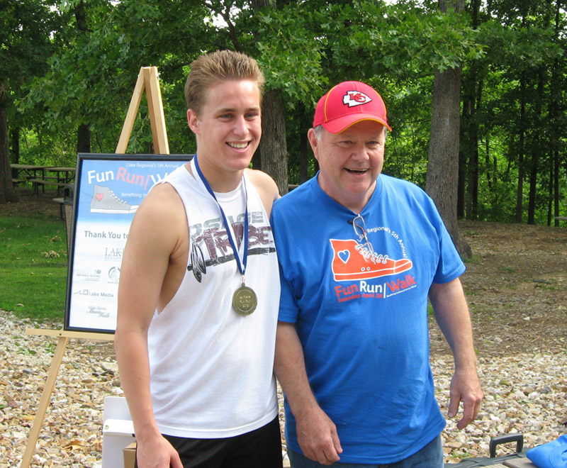 Male 19 & under winner Vincent Sabourin, with Lake Regional's Mike Sullivan.
