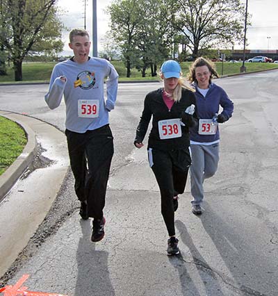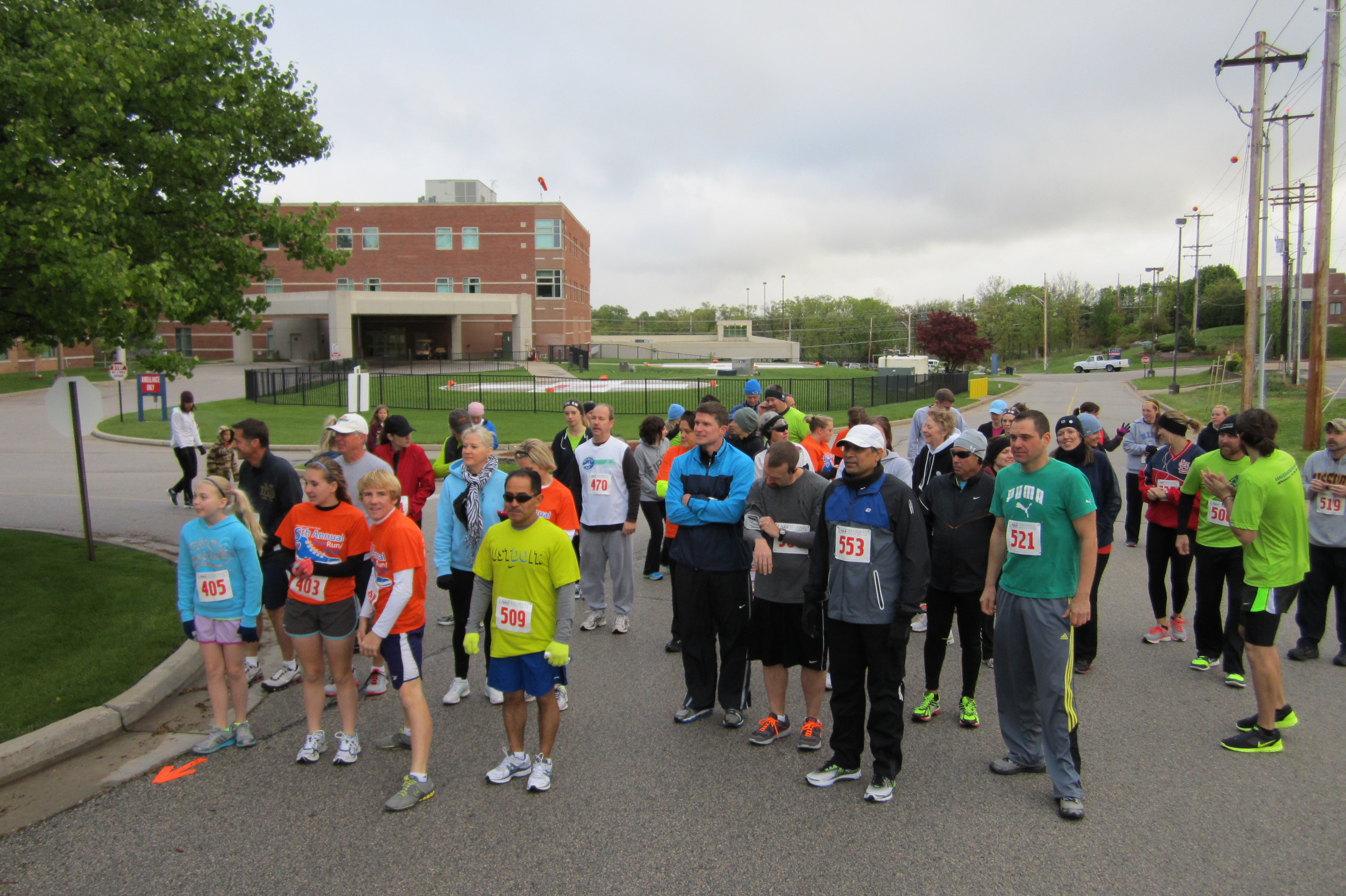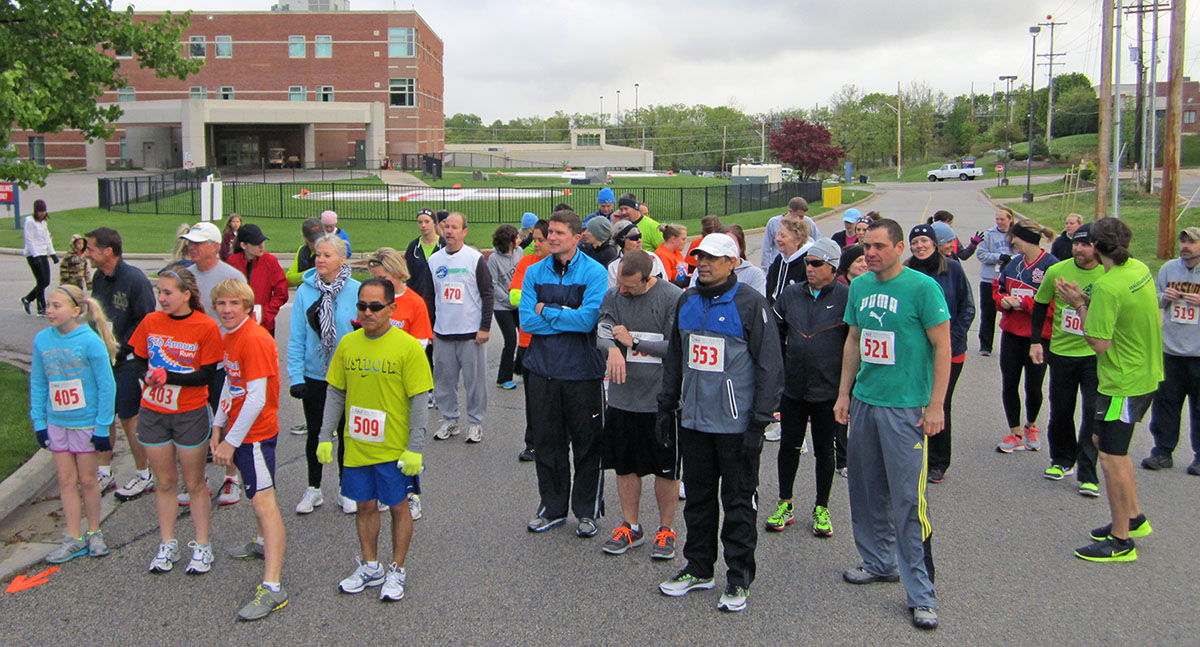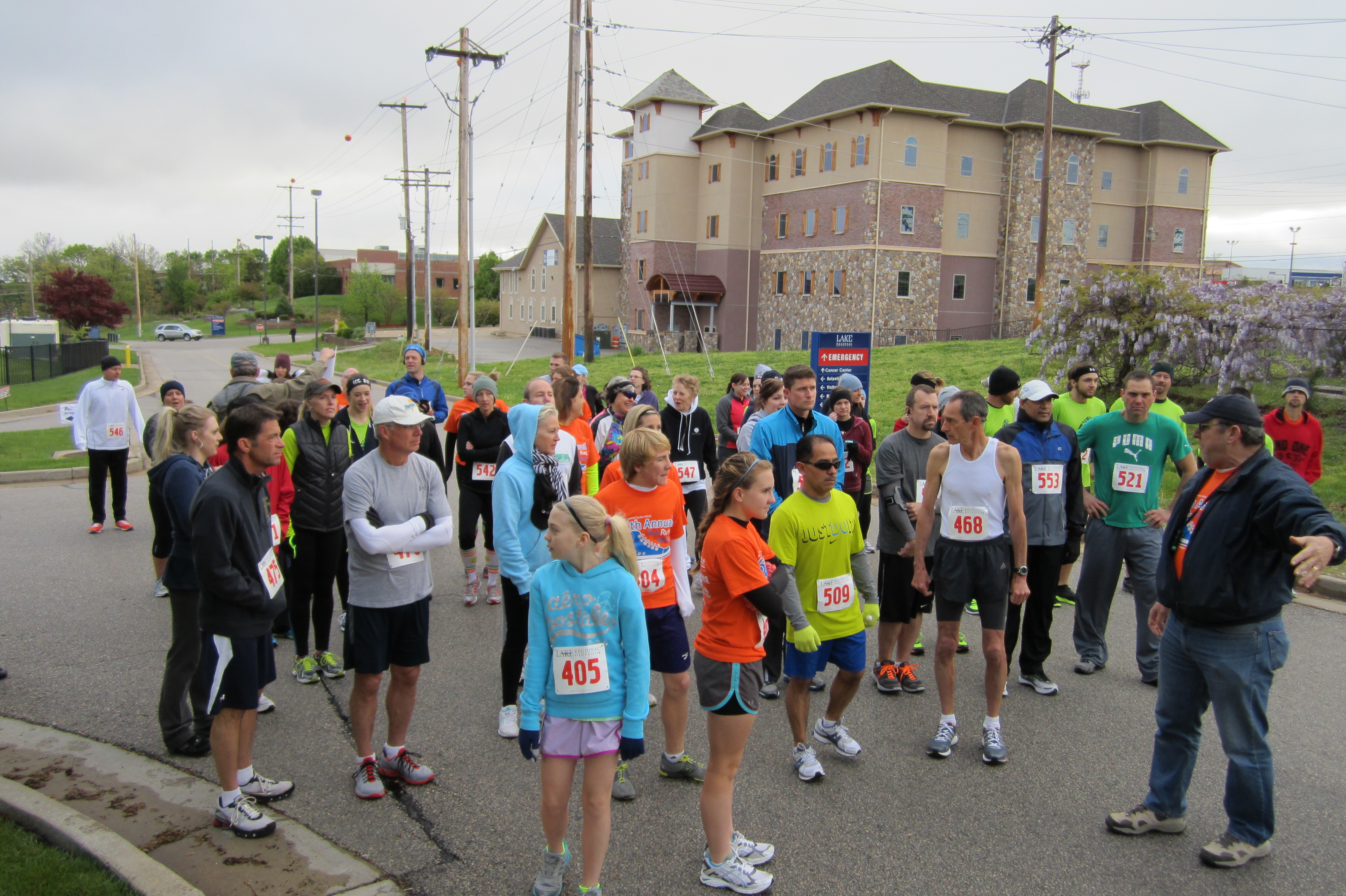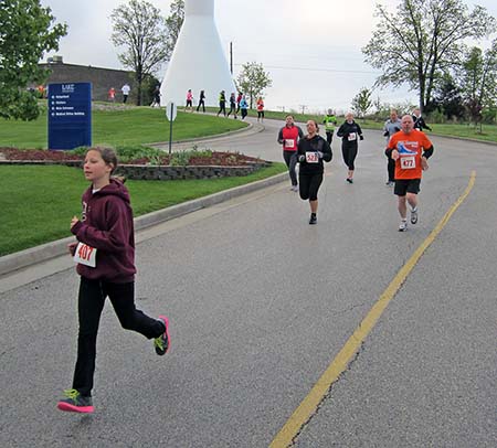 Sara Wolfe (29:11) leads a pack of runners, including Dennis Michaelree (orange shirt at right), around the hospital grounds.