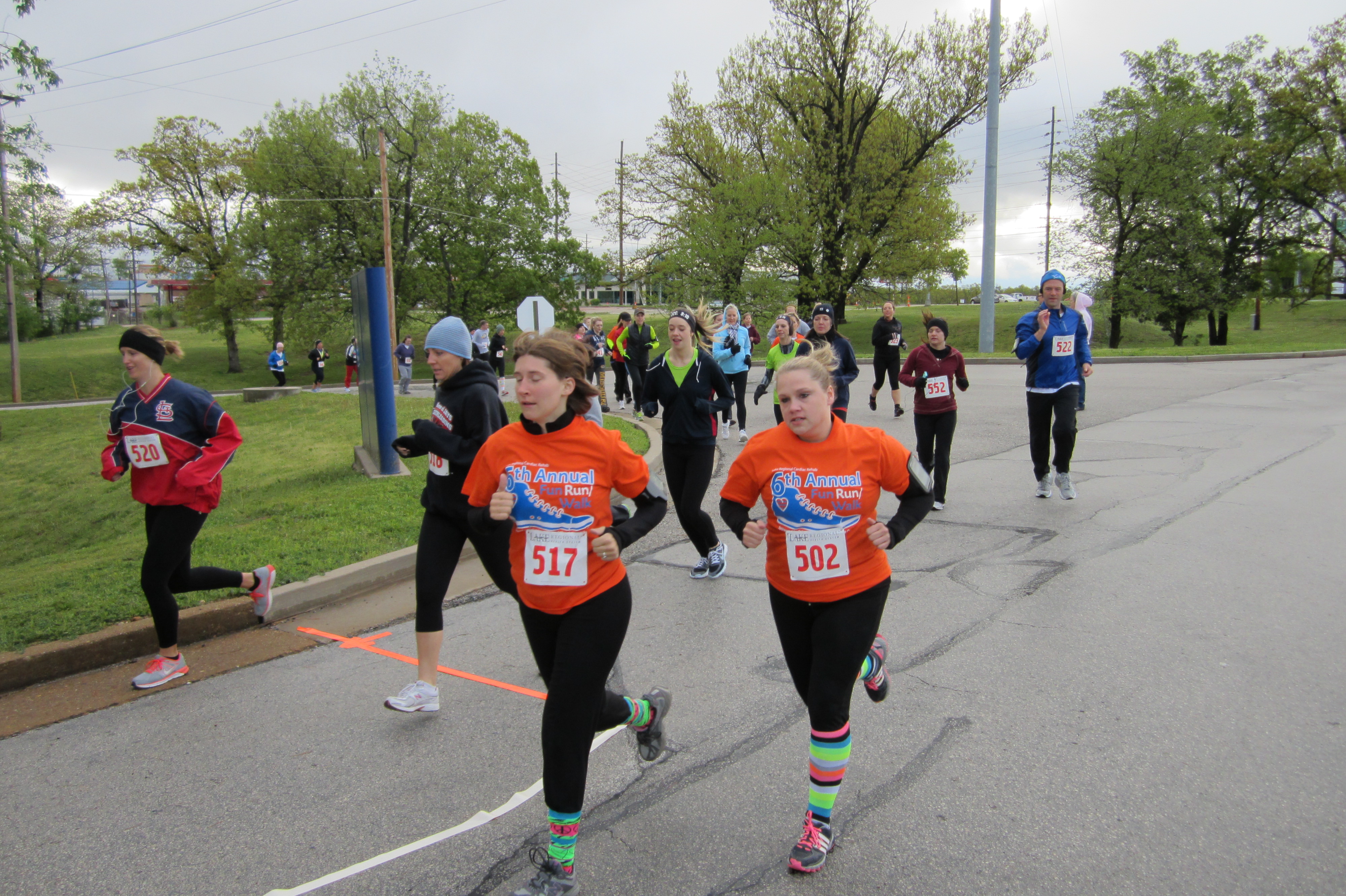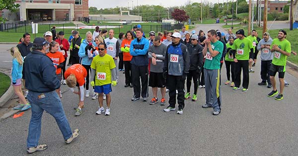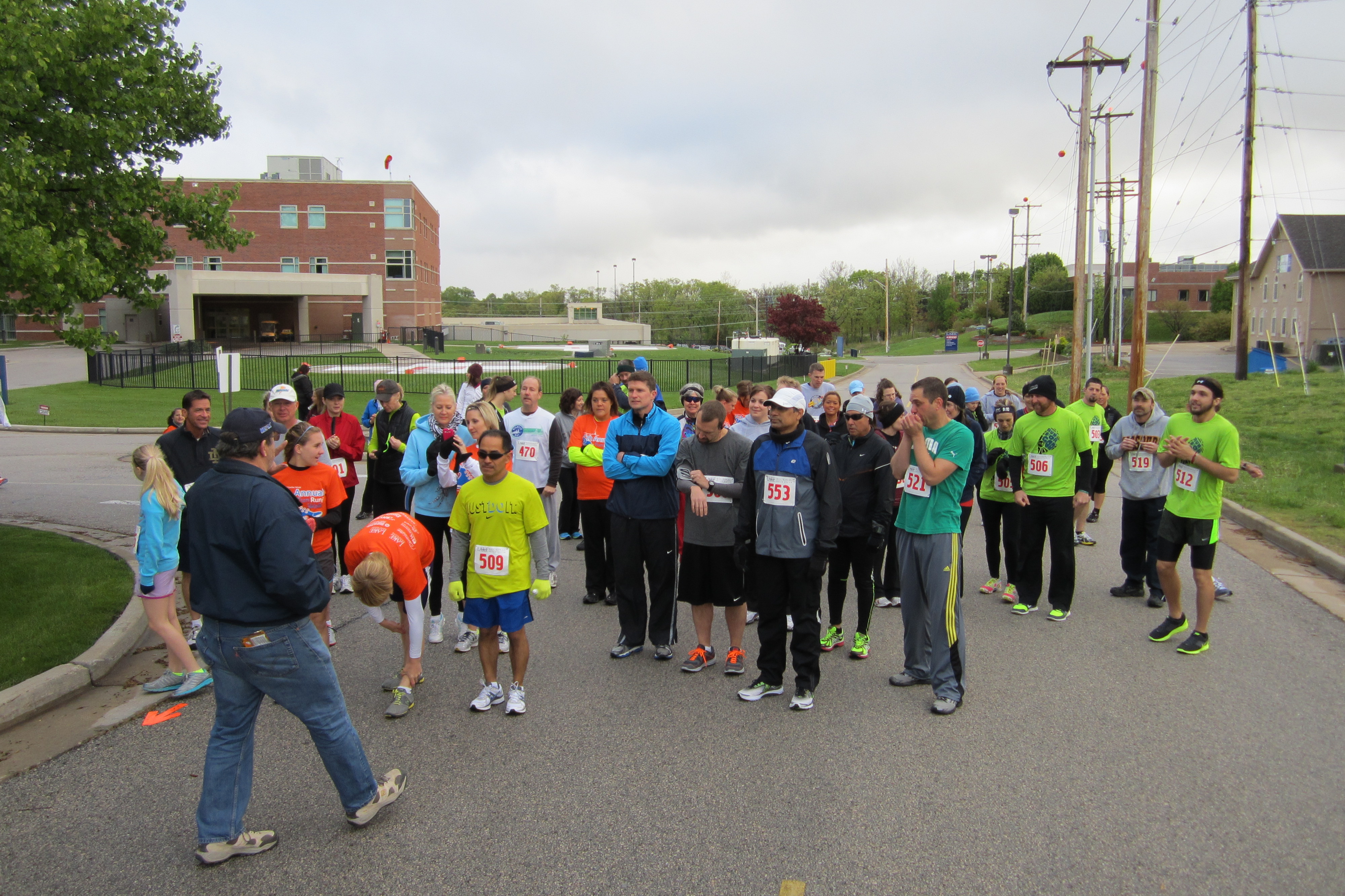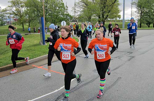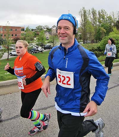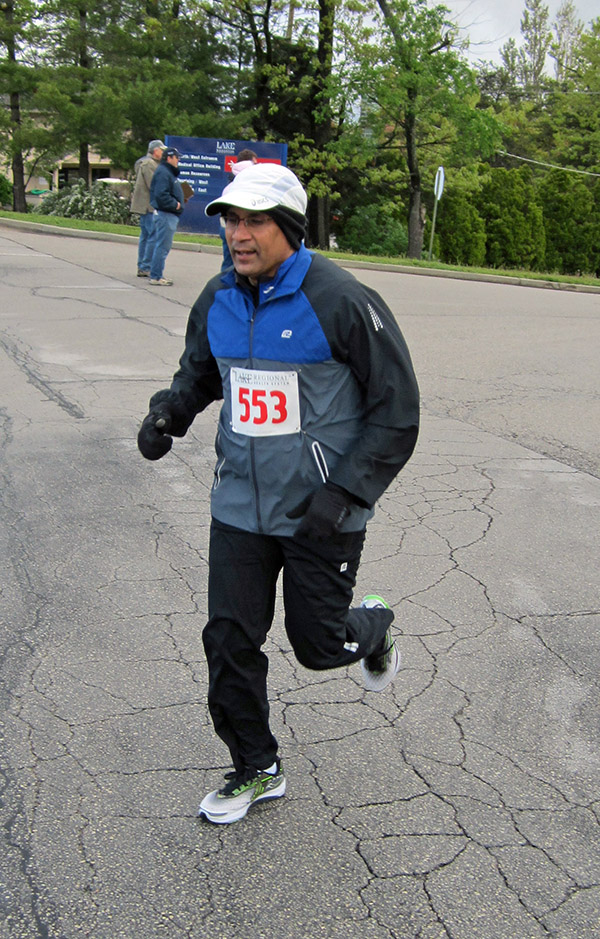 Sara Wolfe (29:11) leads a pack of runners, including Dennis Michaelree (orange shirt at right), around the hospital grounds.