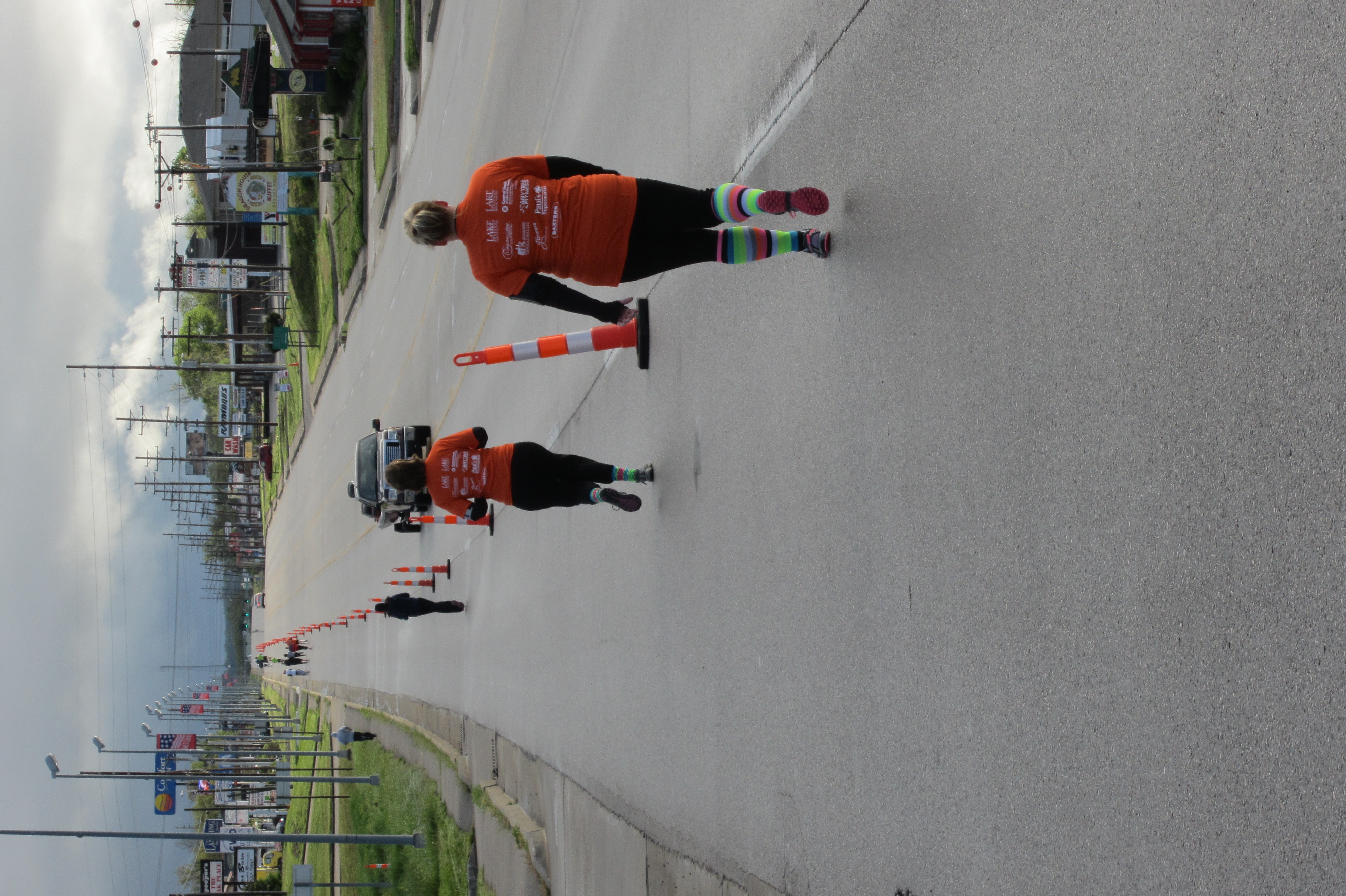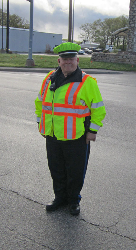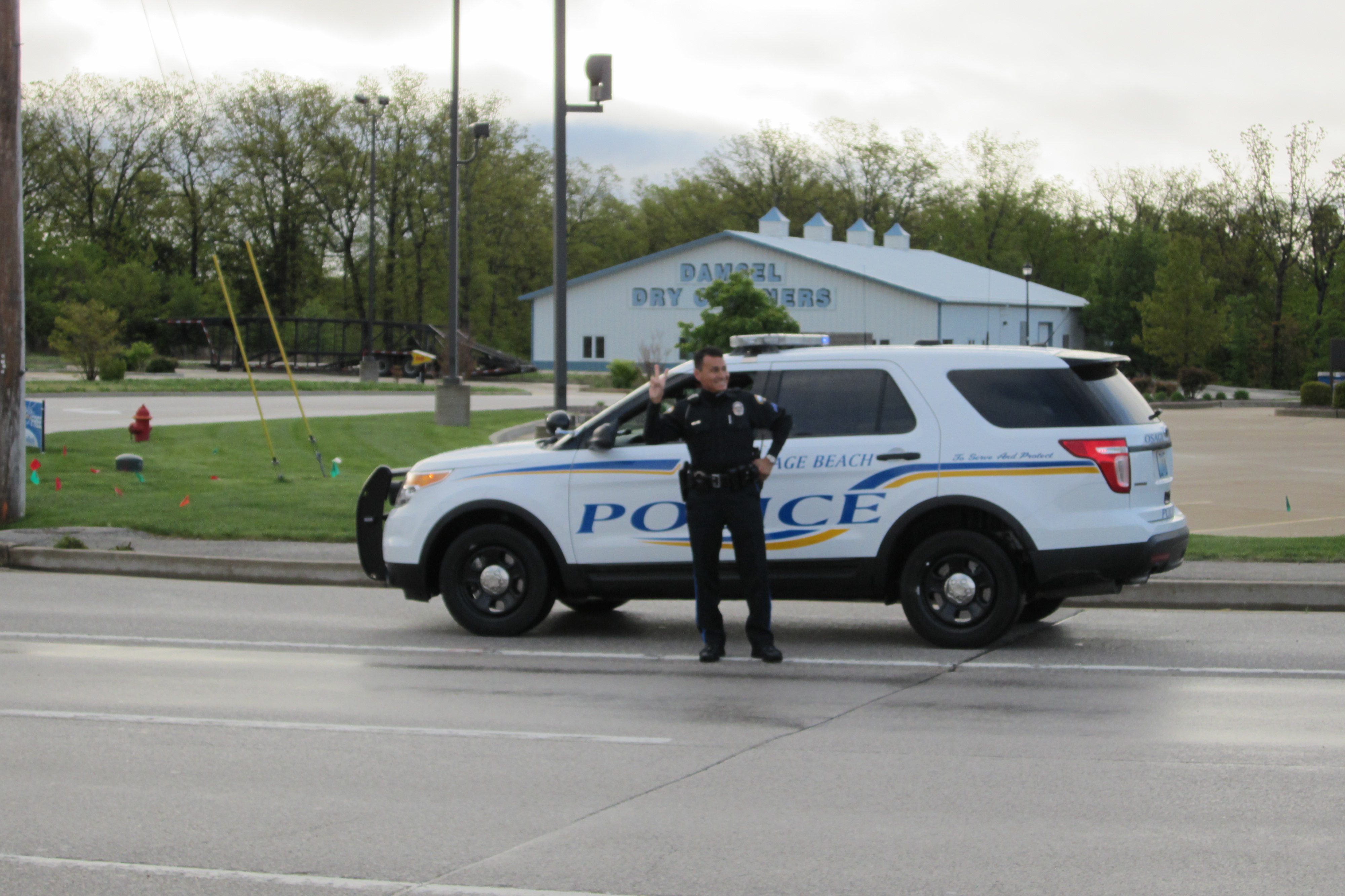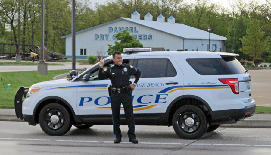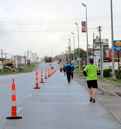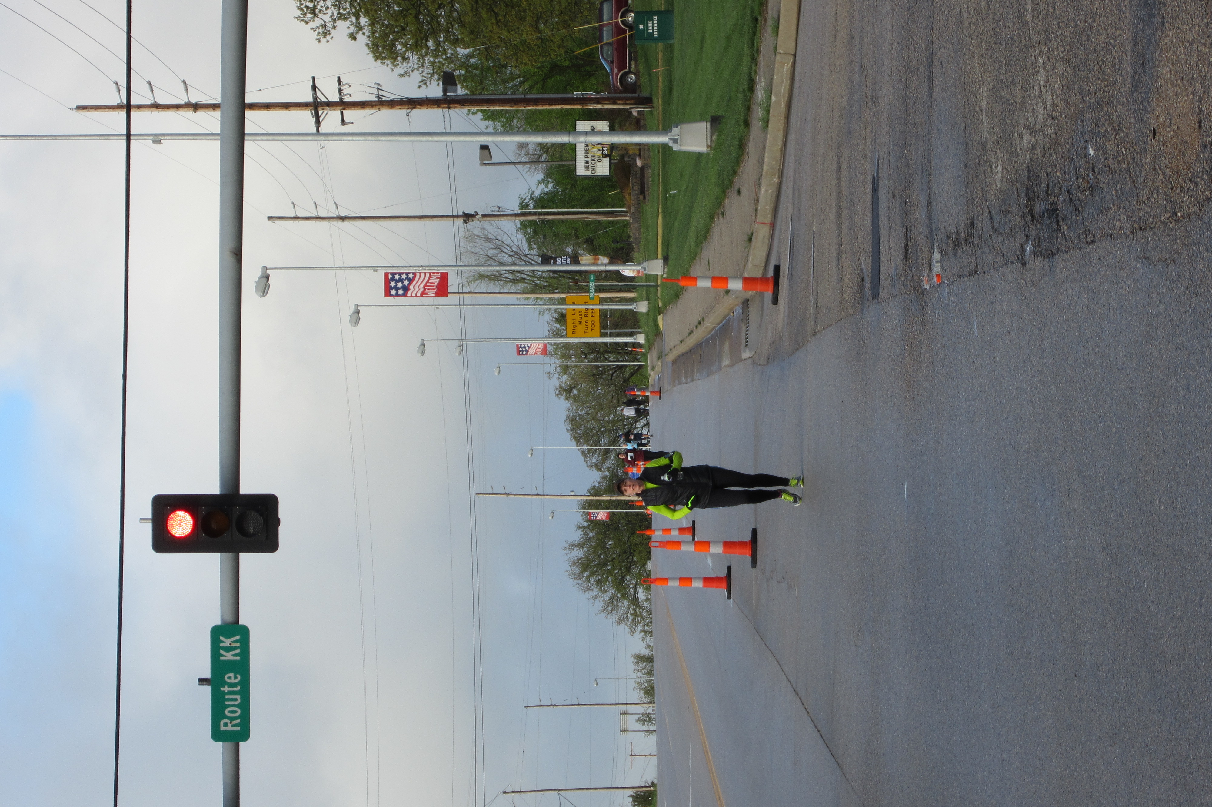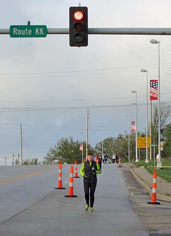 An Osage Beach police officer directed traffic at Osage Beach Parkway and KK, giving runners safe passage through the intersection.