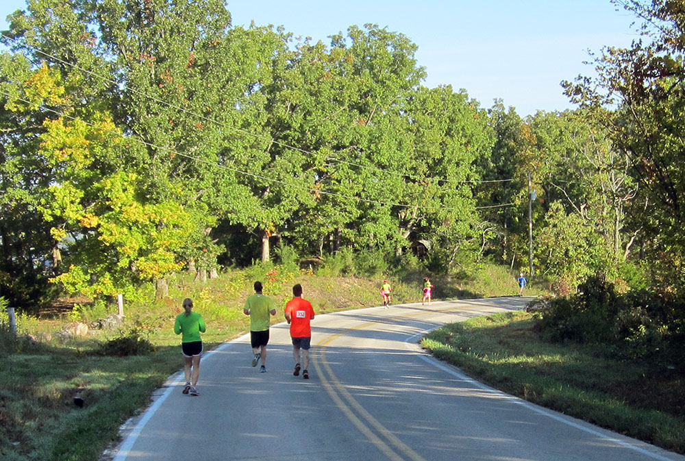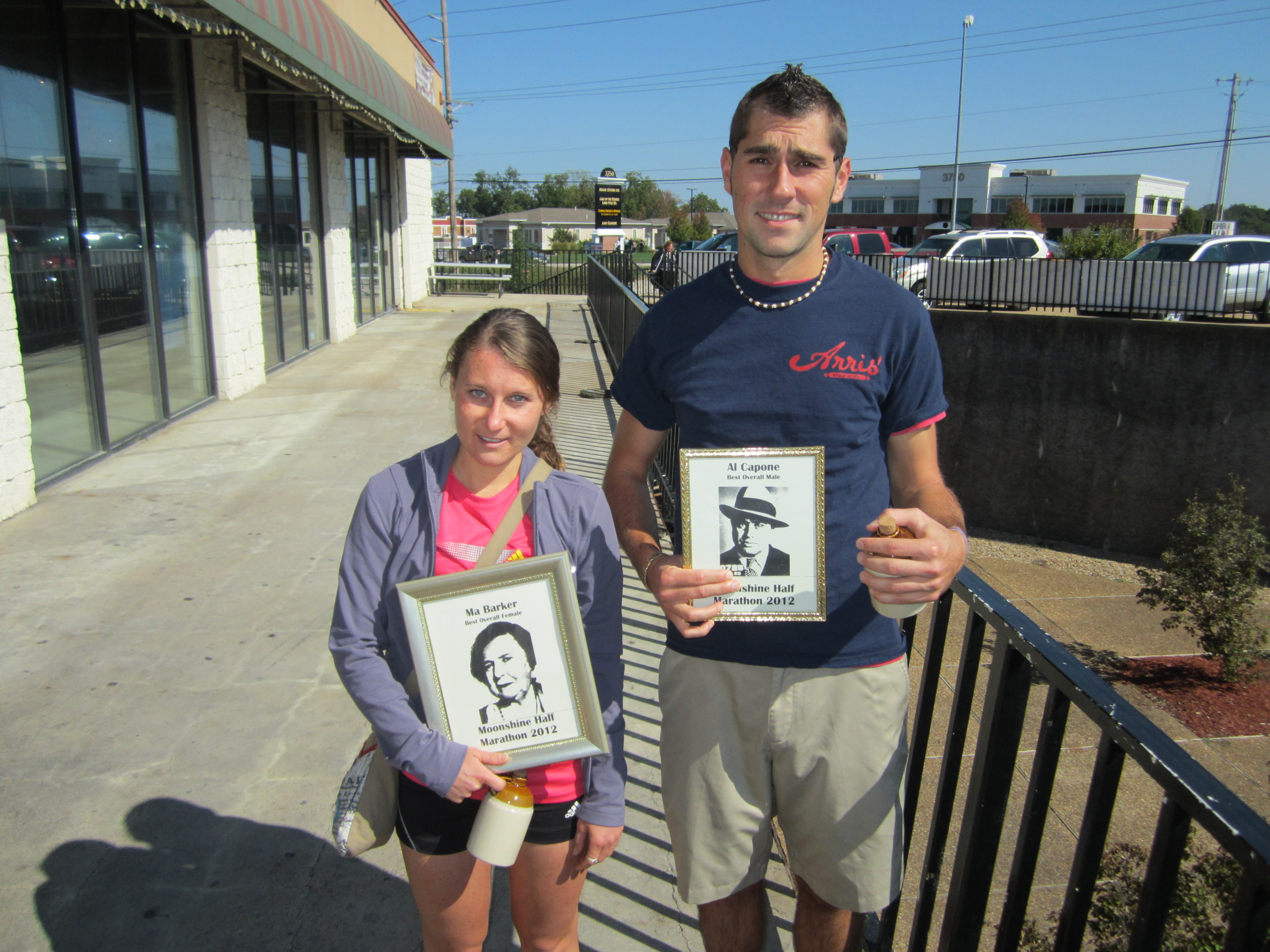 Overall female and male winners Heather Kuhlmann (Lake Ozark, Missouri; 1:30:54) and Andy Goessmann (Osage Beach, Missouri; 1:32:54) (Download)