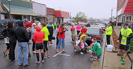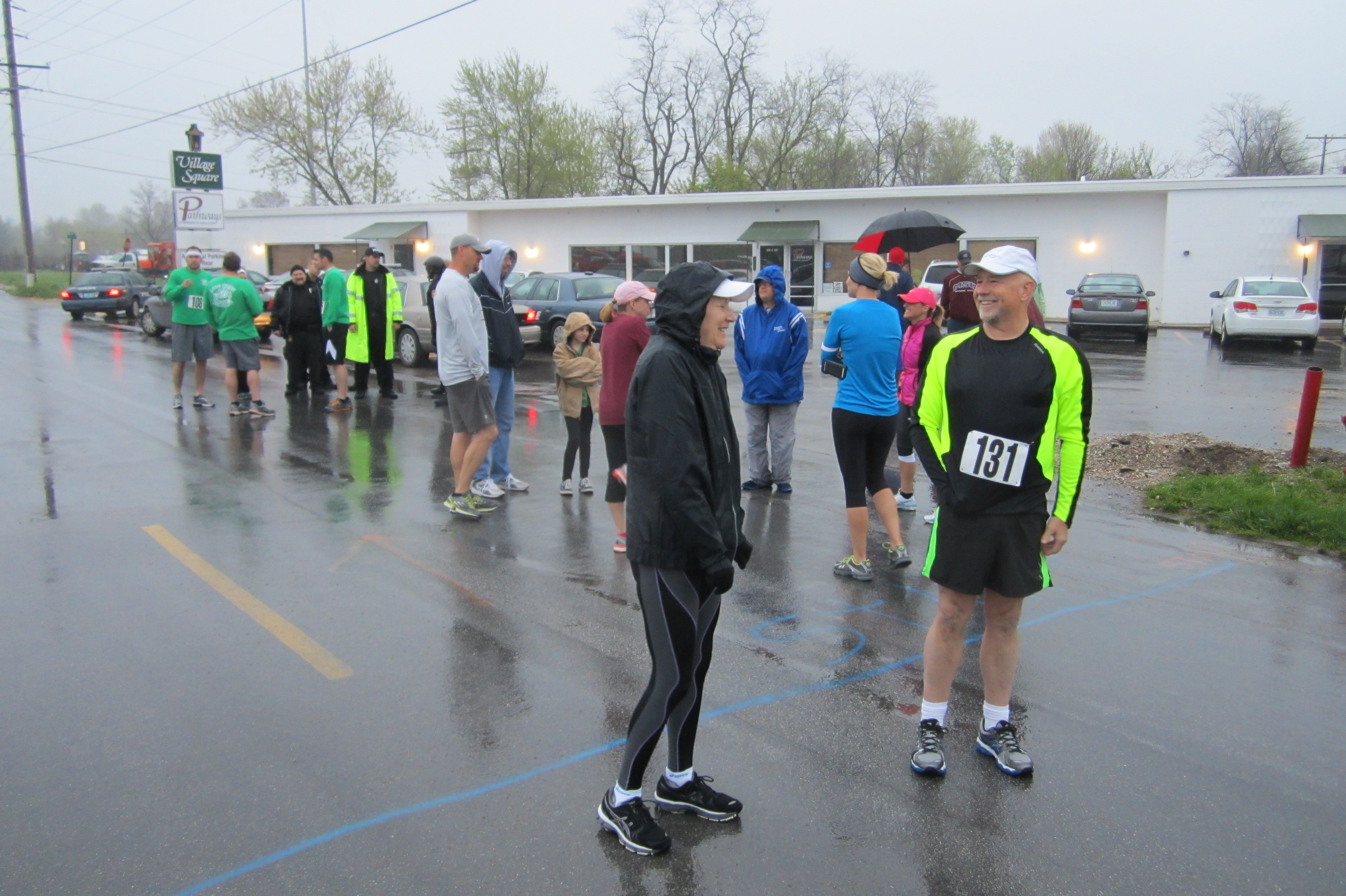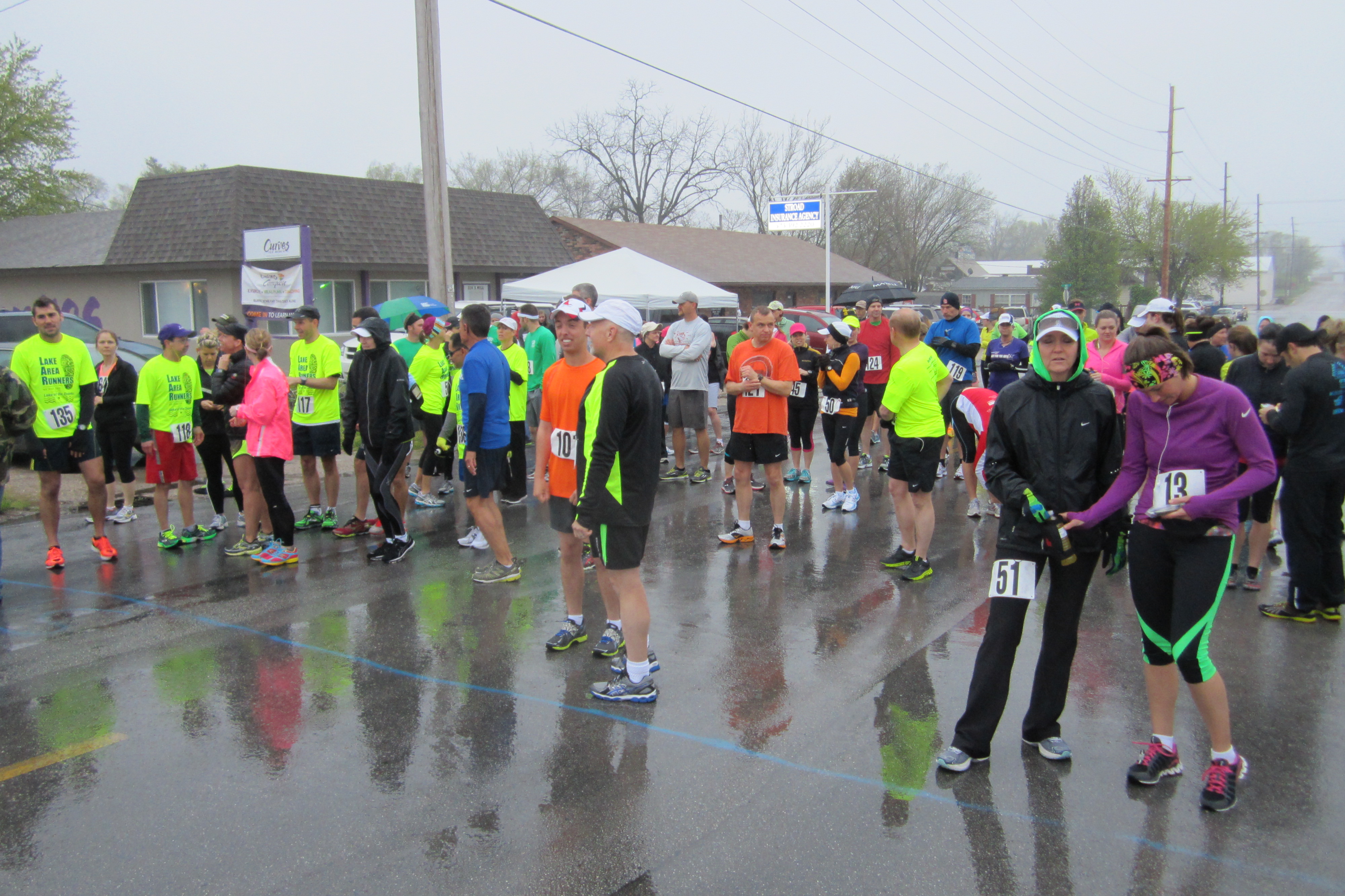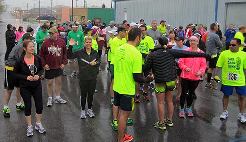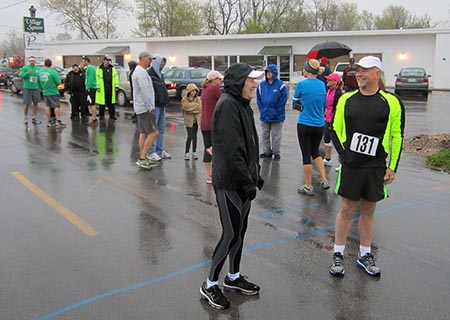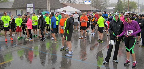 Runners find shelter from the mist and wind soon before the start. The gentleman with the sunglasses resting on his head, Brian Schulte (1:26:02), was the overall male winner.