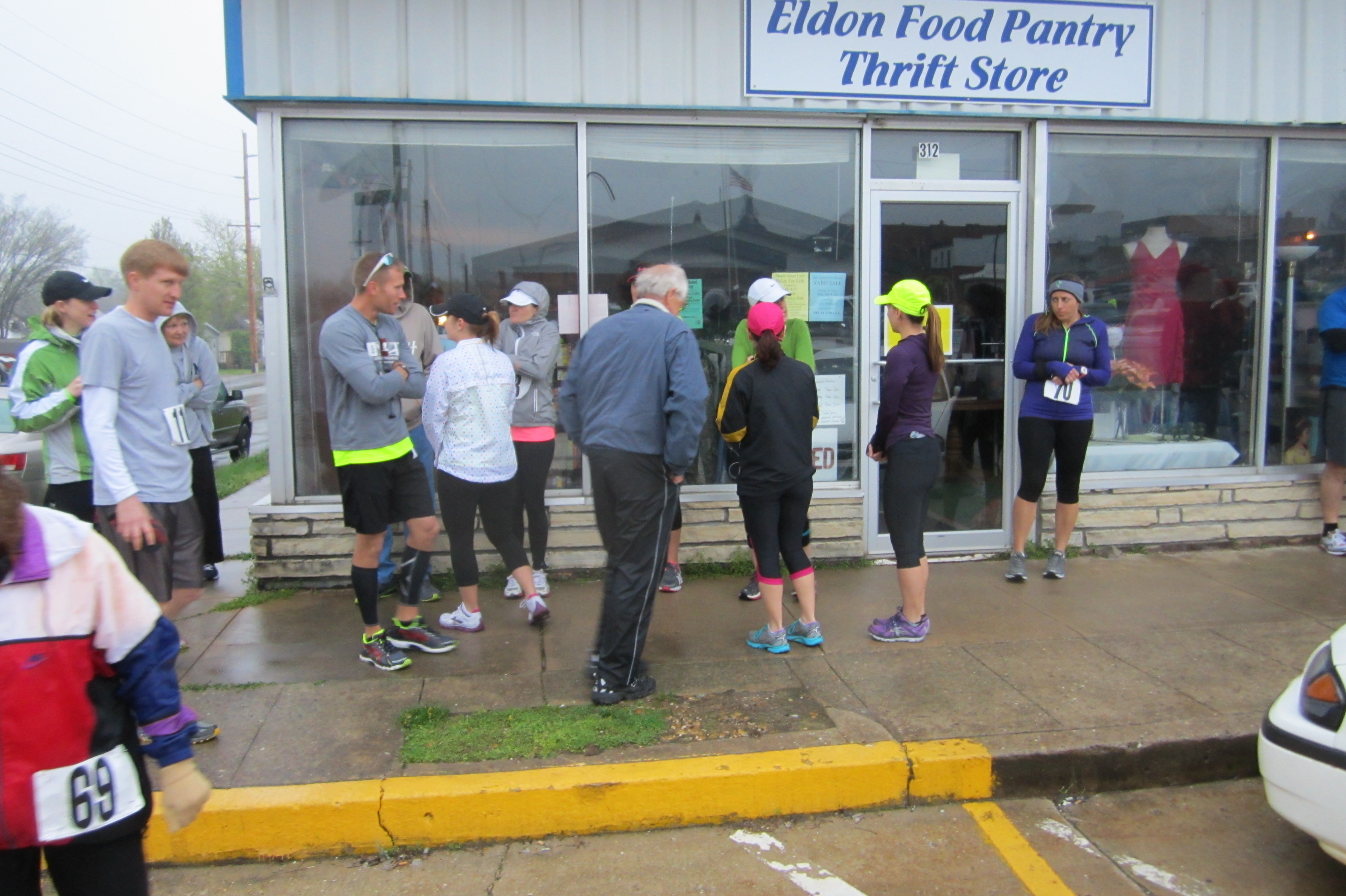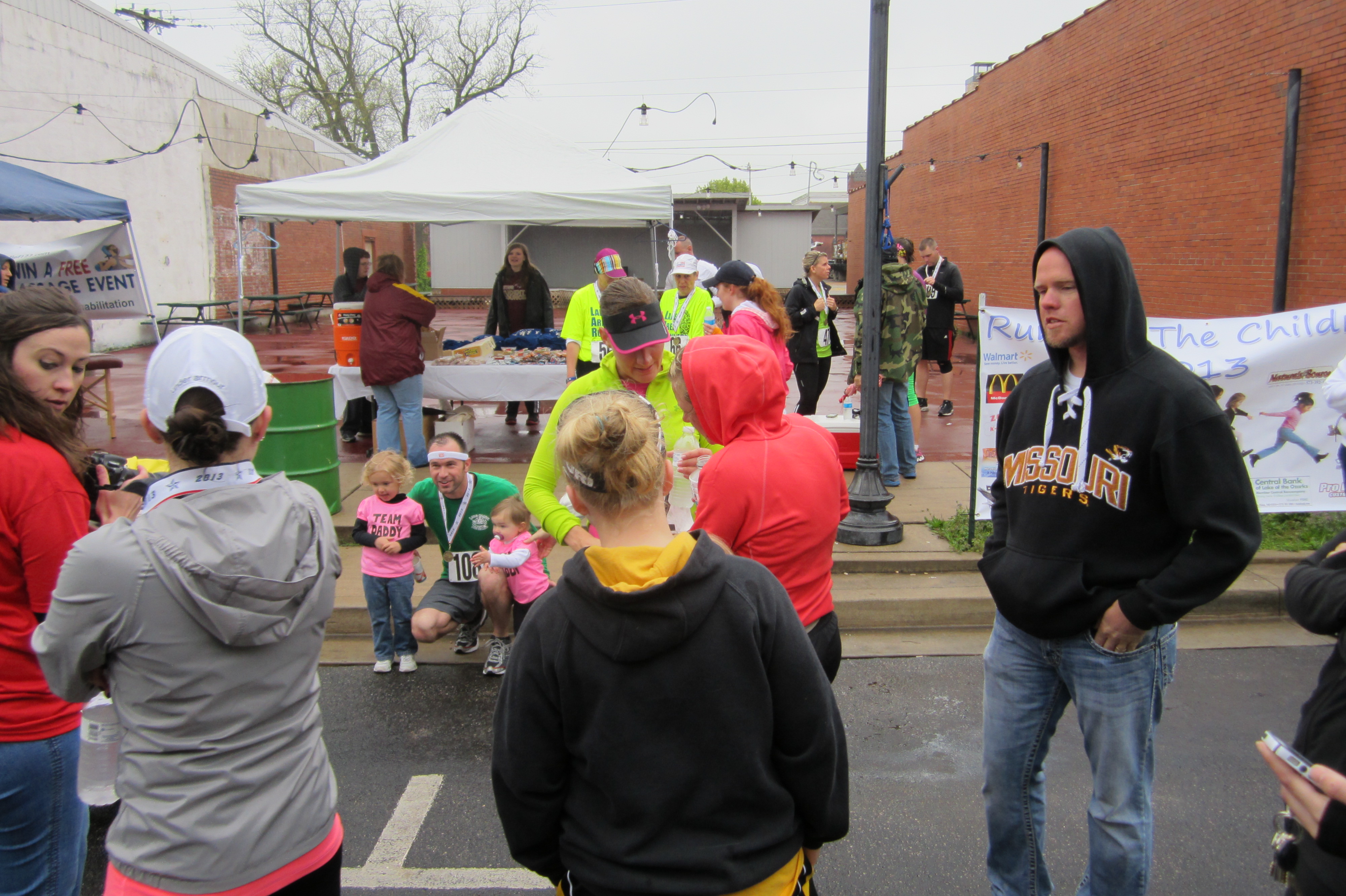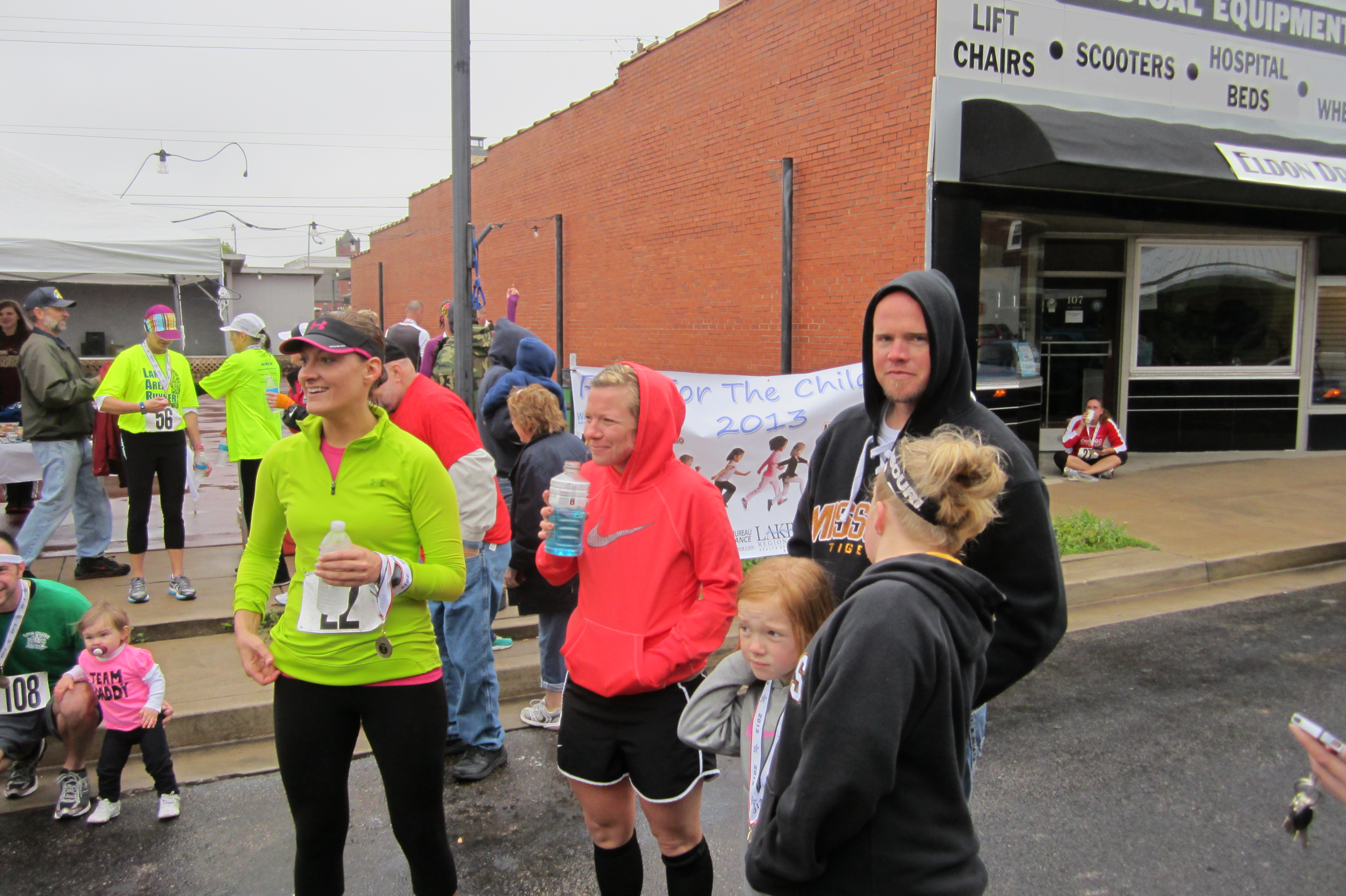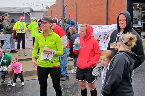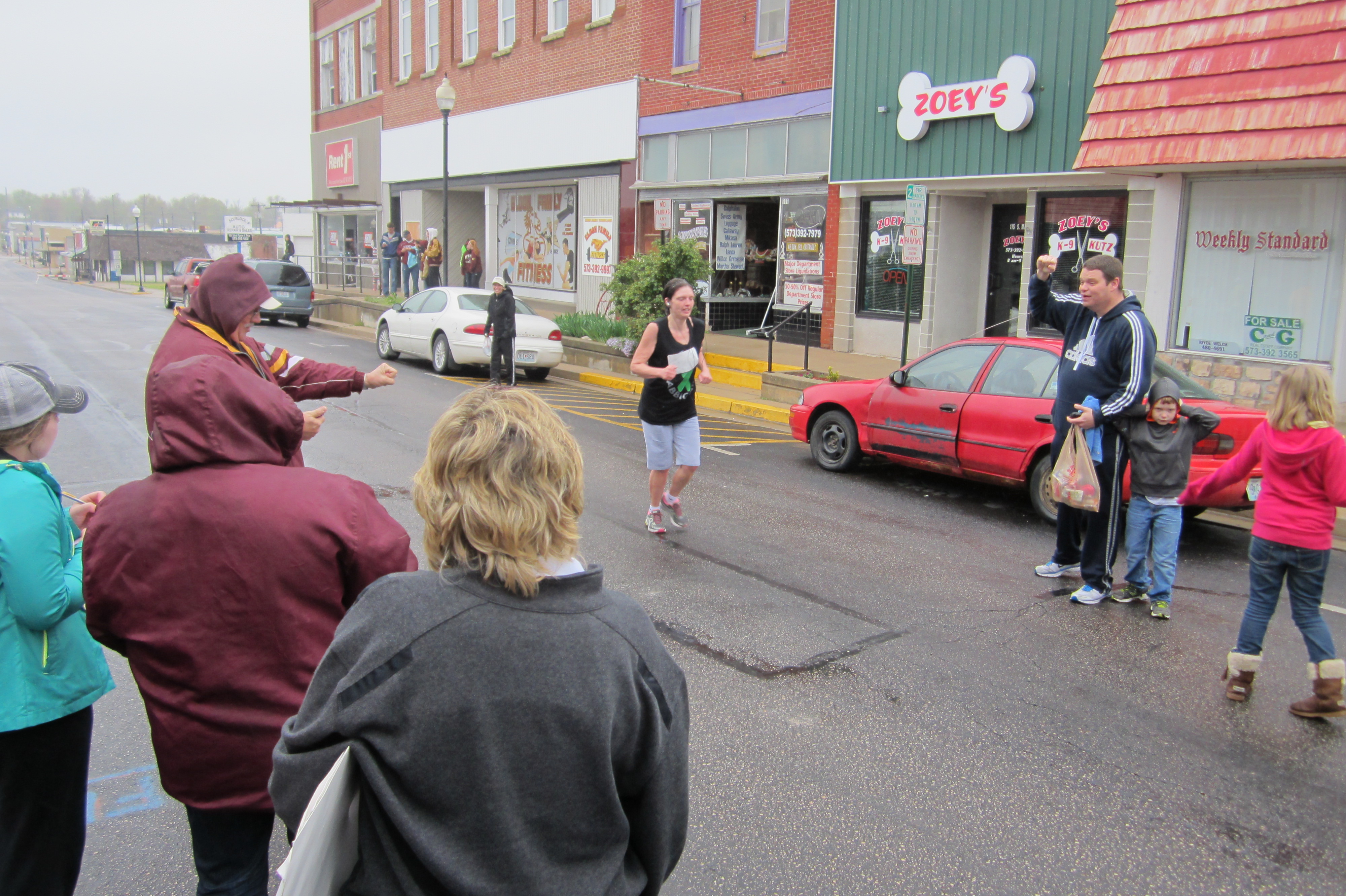 Jayna Gray (2:26:24) is welcomed at the finish line by her husband and (I assume) her son (with hands to his ears). Jayna is one of the organizers of the wildly successful Ta-Ta Trot 5K, coming up on May 11th. She used to be only a walker at the various 5Ks in Eldon before starting to run them last year. And now, she's a half marathon finisher. Congratulations, Jayna! You've come a long way!