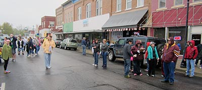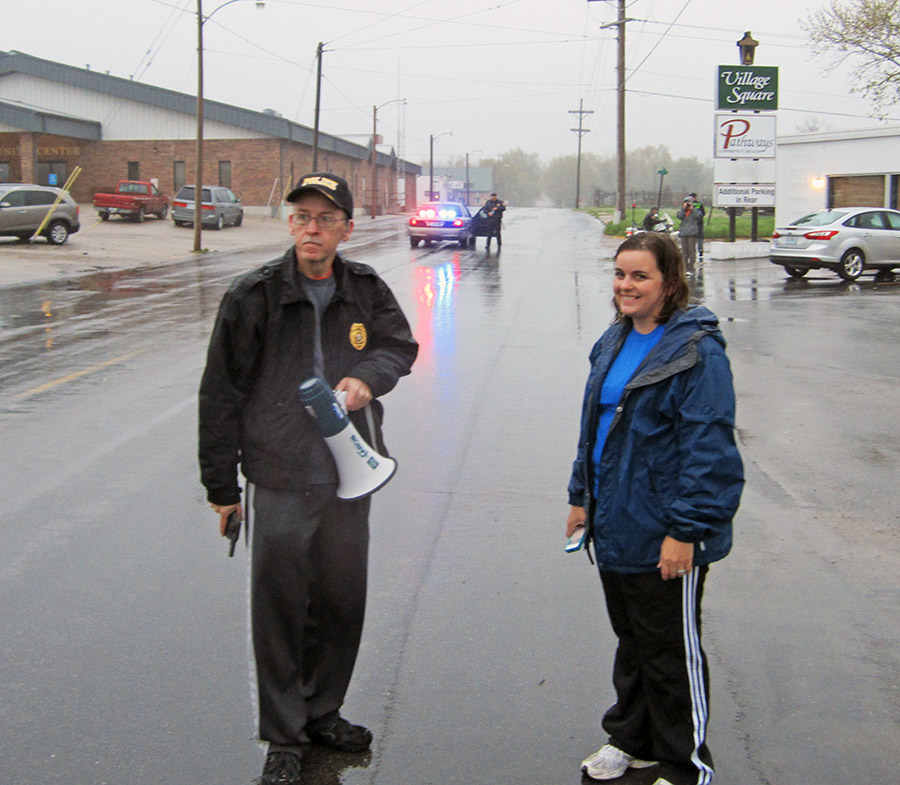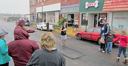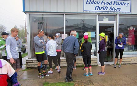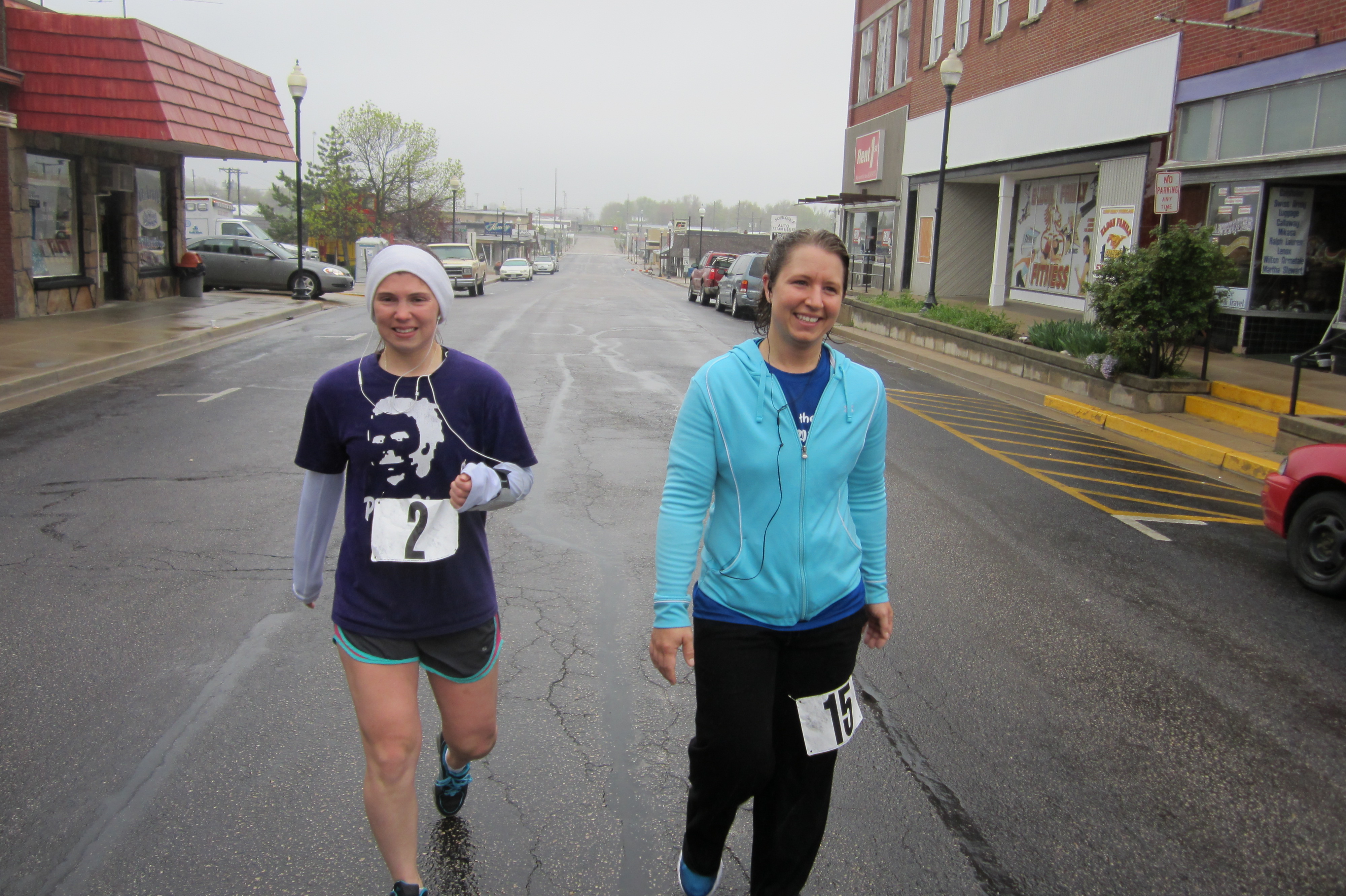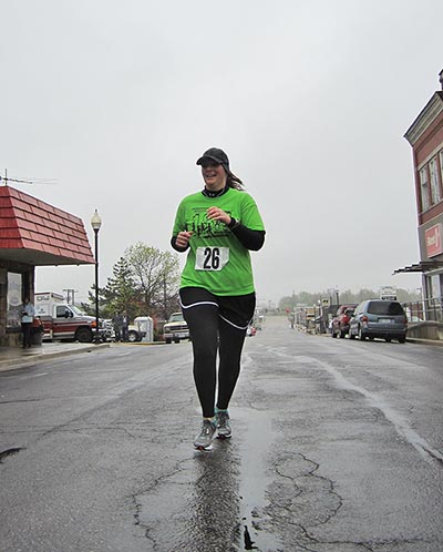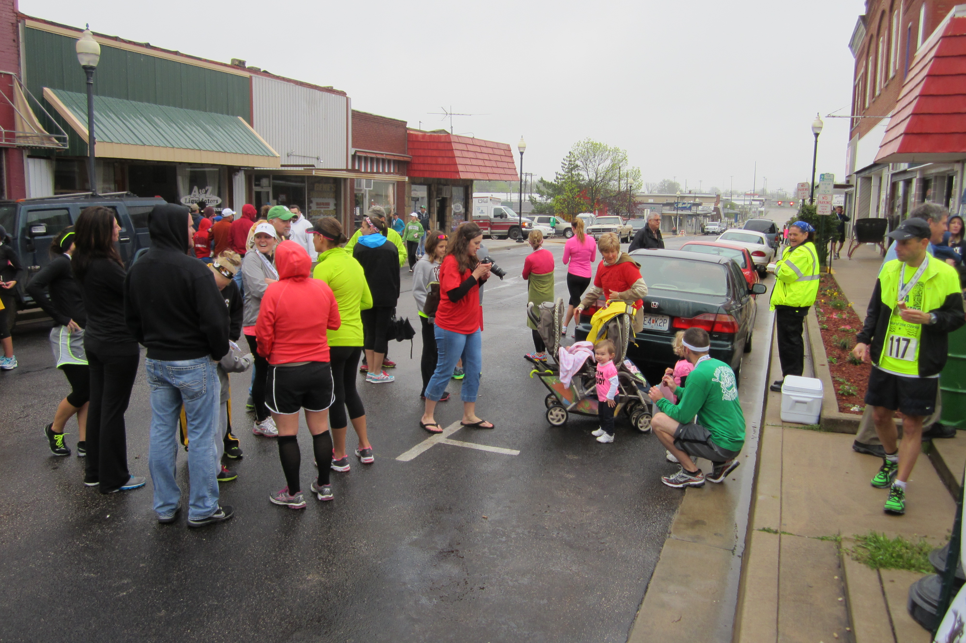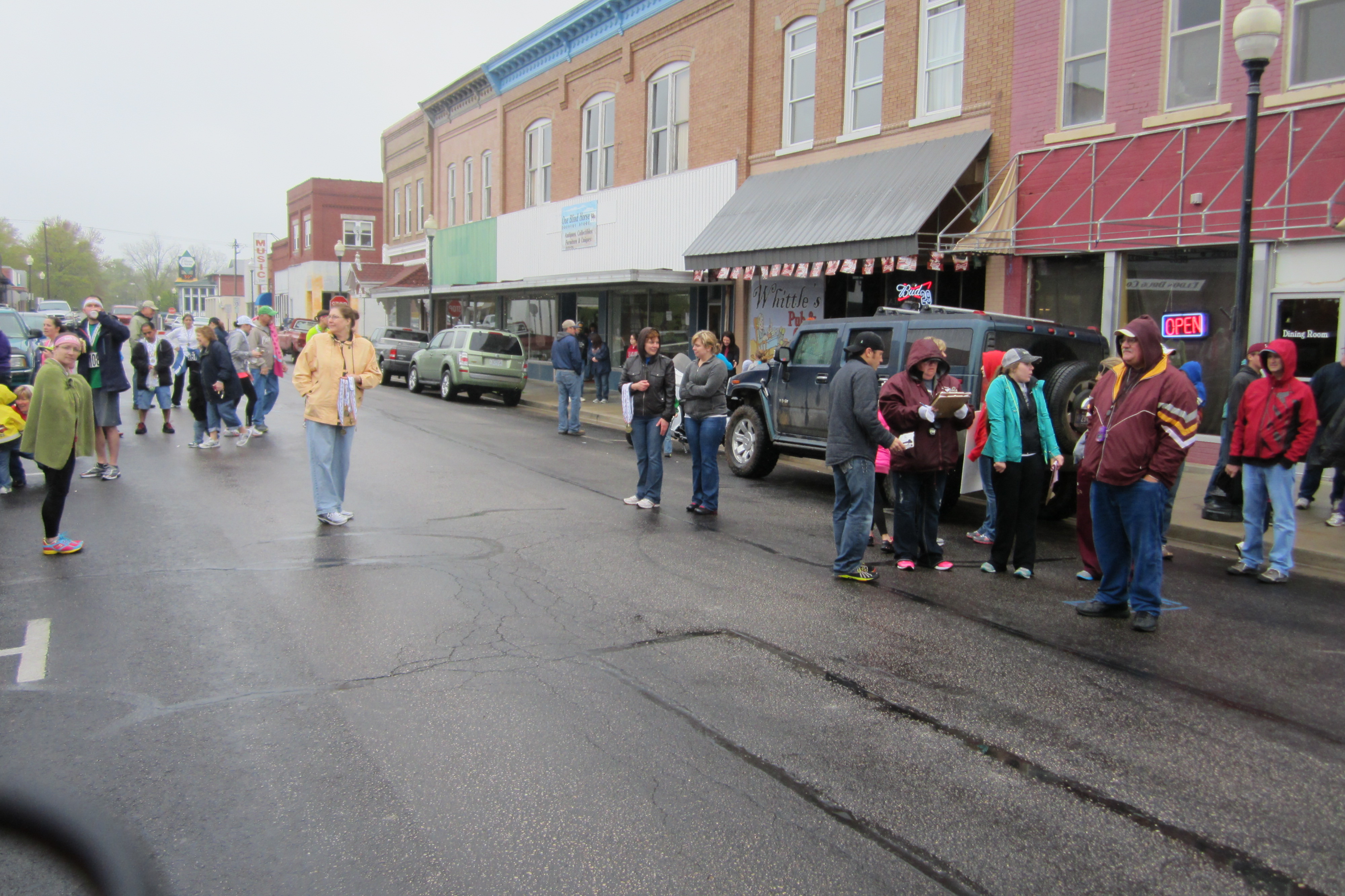 Jayna Gray (2:26:24) is welcomed at the finish line by her husband and (I assume) her son (with hands to his ears). Jayna is one of the organizers of the wildly successful Ta-Ta Trot 5K, coming up on May 11th. She used to be only a walker at the various 5Ks in Eldon before starting to run them last year. And now, she's a half marathon finisher. Congratulations, Jayna! You've come a long way!