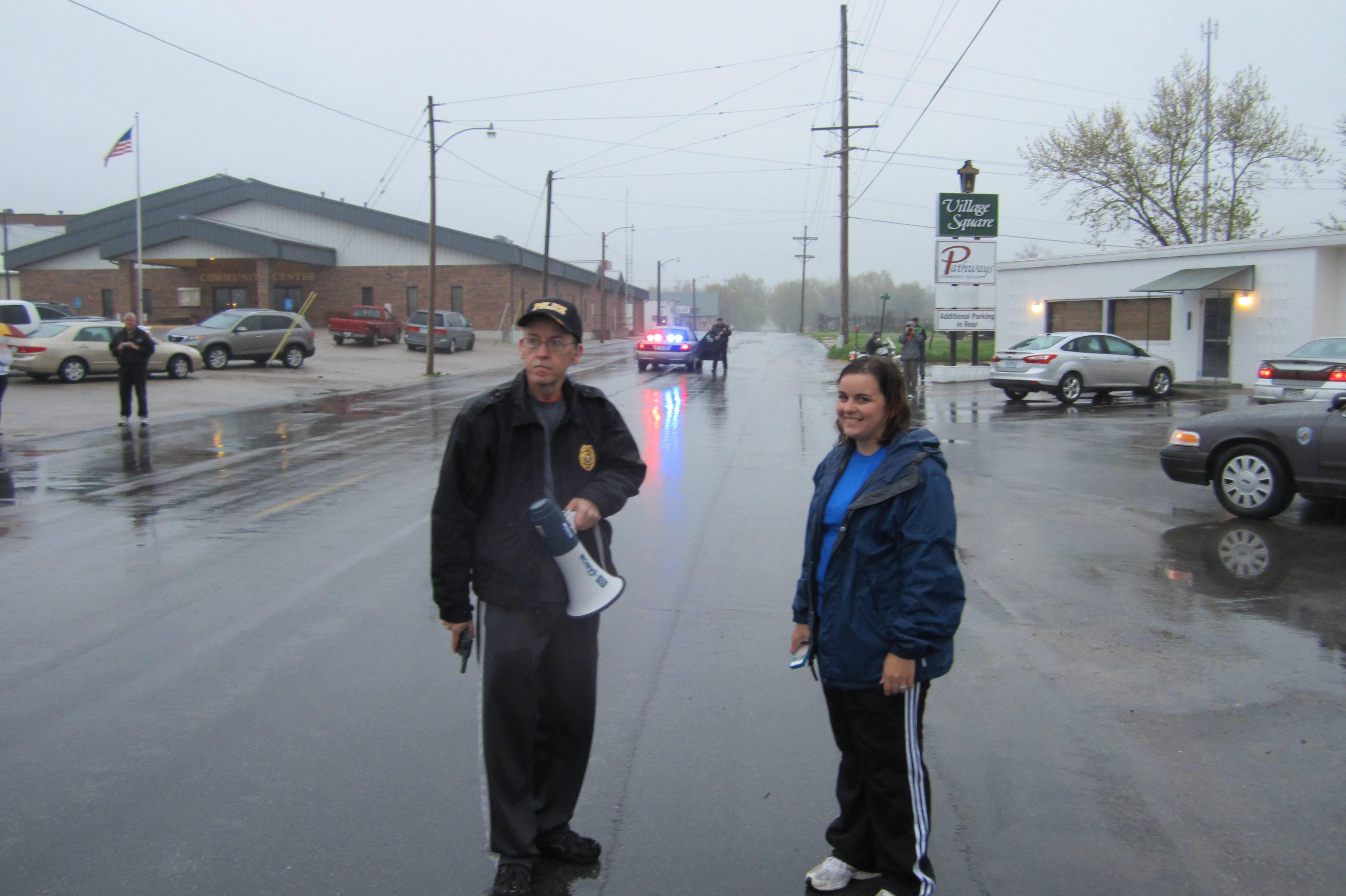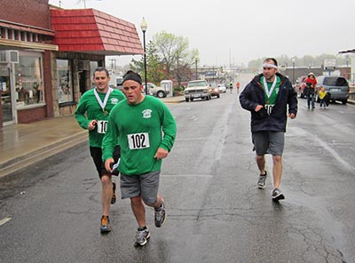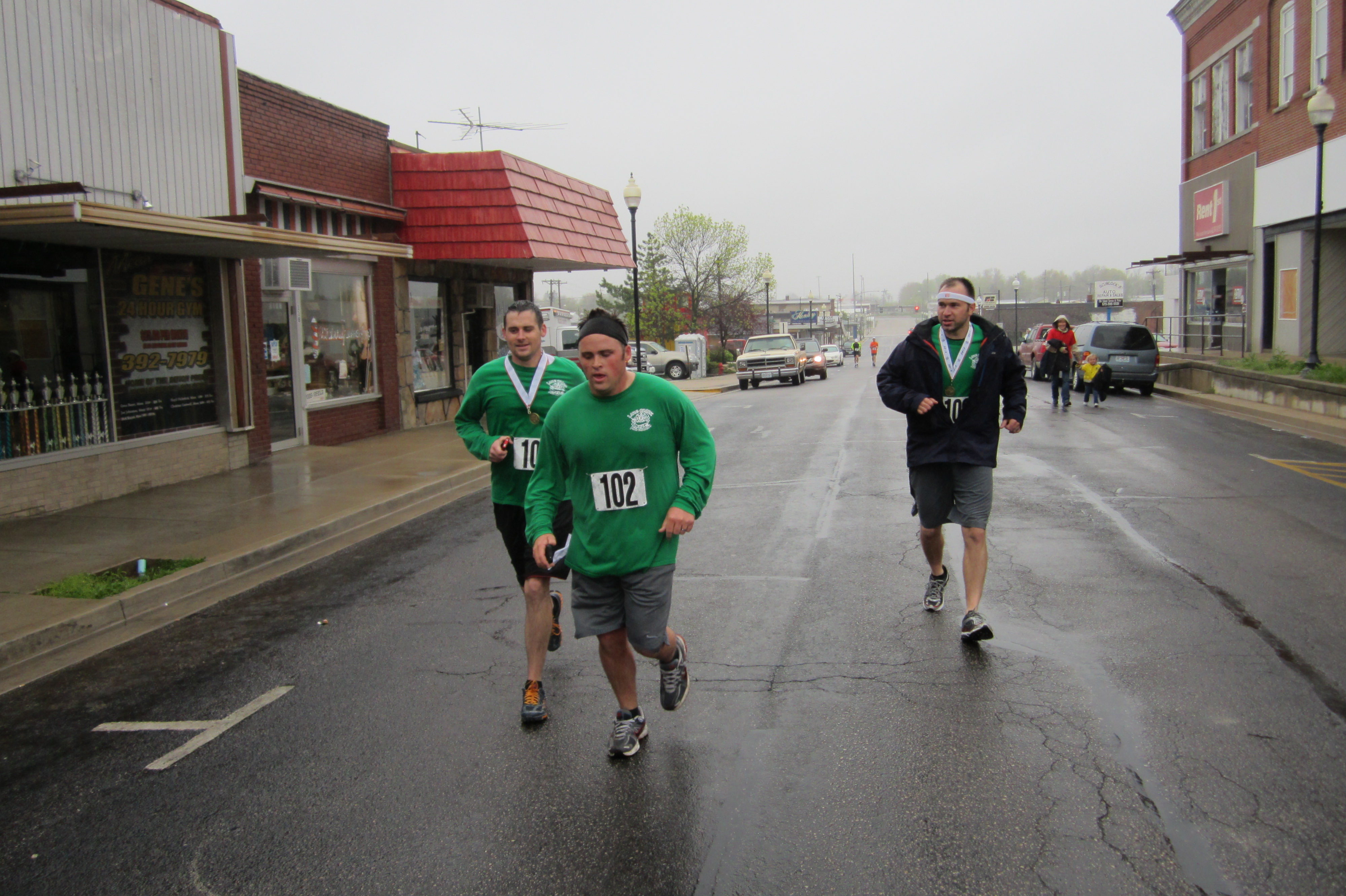 This is my favorite photo of all, especially if I'm correct in what I think is going on. I believe these three are firemen for the Lake Ozark Fire Protection District. (I zoomed in on the logo on the t-shirt, but it's a bit fuzzy). The runner in the middle is Jeremy Phillips (2:46:14) , about to cross the finish line. To his sides are Bobby Allison (2:06:20) (pictured at left) and Caleb Freese (2:06:21) (right, wearing jacket). Bobby and Caleb finished forty minutes earlier than Jeremy, then went out to meet their comrade and escort him to the finish line.